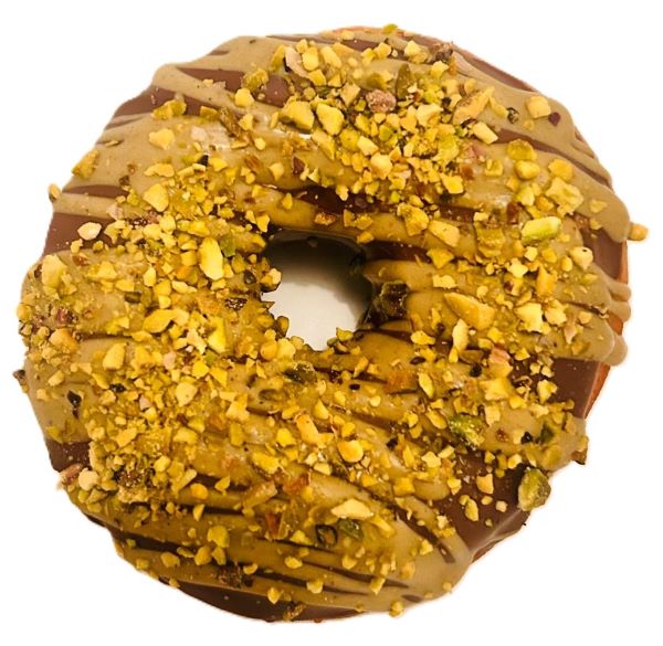Un mariage audacieux entre la douceur du chocolat et la finesse de la pistache. Ce donut moelleux à base de pâte artisanale est garni d’un duo de crèmes onctueuses — chocolat noir intense et pistache délicate — et parsemé d’éclats de pistaches croquantes pour une touche gourmande et raffinée.