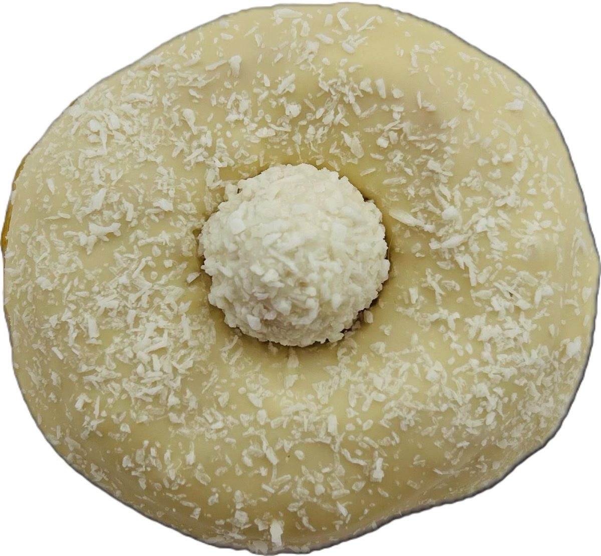 Succombez à l’élégance sucrée de notre donut Raffaello, une création originale qui marie la tendresse d’un beignet moelleux à la délicatesse du célèbre bonbon. Ce donut est nappé d’un glaçage blanc onctueux, parsemé de copeaux de noix de coco, et garni d’un cœur fondant à la crème coco-amande, pour une expérience gourmande tout en finesse.